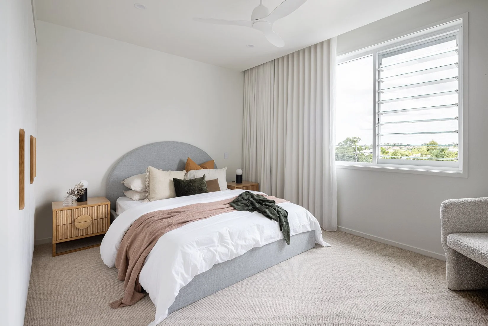A sophisticated blend of raw and refined materials adds warmth and texture, with concrete and timber working in unison to create a home that feels both grounded and welcoming. Spacious living and entertaining areas flow effortlessly onto landscaped terraces, further strengthening the connection to nature. More than just a response to its site, Clare House exemplifies modern home design—an intelligent, livable space that highlights the potential of architectural solutions for sloping blocks in Brisbane.
